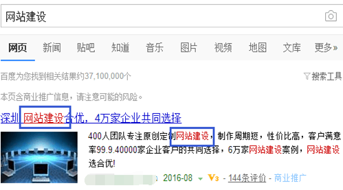 好比搜索“網(wǎng)站建設(shè)”時(shí),創(chuàng)意的飄紅情況如下,其中與搜索詞一致或意義相近的部分均獲得了飄紅: